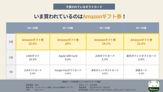 2025年の調査では、いま買われているギフトカードの1位は全世代でAmazonギフト券となりました(20代25.6%/30代20.0%/40代24.1%/50代22.4%)。2位以下は世代によって顔ぶれが分かれ、20代はLINEギフト、30代はApple Gift Card、40代はJCBギフトカード、50代は楽天ポイントギフトカードが上位に入りました。