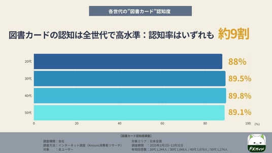 また、世代間の差も小さく、最も高い40代は89.8%、最も低い20代でも88.0%と、その差は最大1.8ptにとどまりました。大きな偏りが見られないことから、図書カードは特定の年代に限らず幅広い層に浸透していることがうかがえます。