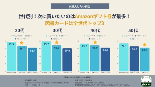 2025年の調査では、知っている人の中で「次回購入したい」割合が最も高いのは、全世代でAmazonギフト券(20代77.5%/30代79.2%/40代73.2%/50代74.1%)でした。
