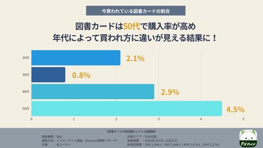 一方、図書カードがいま買われている割合は(20代2.1%/30代0.8%/40代2.9%/50代4.5%)となり、特に50代で相対的に高い結果となりました。