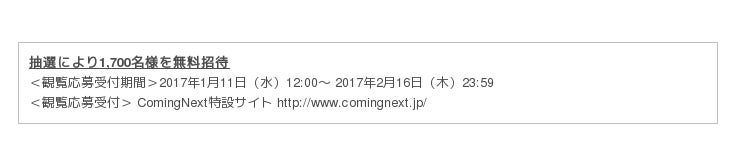 本日より観覧受付を開始いたしますので、以下の概要をご確認の上、是非ご応募いただきます様、お願いいたします。出演者のプロフィール等の詳細は、Coming Next 2017特設サイト(http://www.comingnext.jp/)をご参照下さい。