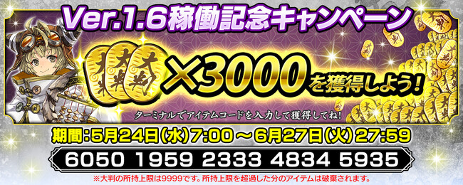 また、今回の新バージョンの稼働を記念して、ターミナルにアイテムコードを入力いただいた方全員に大判3,000枚をプレゼントするキャンペーンも実施いたします。