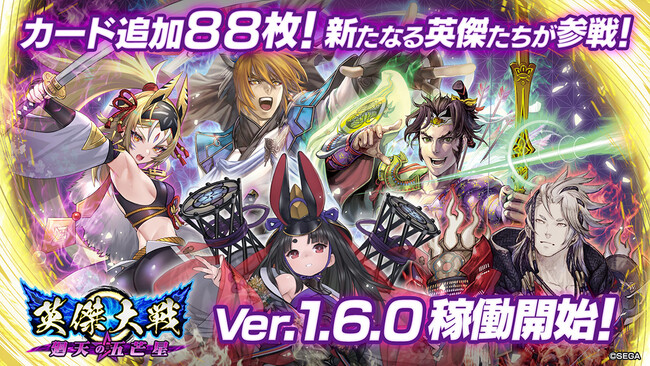 株式会社セガは、本日2023年5月24日(水)にゲームセンター向け対戦型カードアクションゲーム『英傑大戦 廻天の五芒星』(以下、英傑大戦)において、新バージョン「Ver.1.6.0」を稼働開始いたしました。
