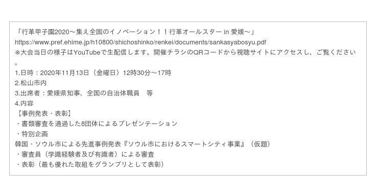 「行革甲子園」とは、地方自治体が取り組んできた「行政改革」の取り組みを全国から募集し、愛媛県が表彰する大会で、今年で5回目の開催となります。質の高い公共サービスを提供し、住民満足度を高めるために、“行政運営にイノベーションをもたらす”ことを「行政改革」をとらえ、実行していくことが必要である、というコンセプトです。また、各自治体間でアイデアやノウハウを共有し自らの取組に活用していただくことで、行政改革の更なる推進を図ることを目的にしており、今年は11月13日(金曜日)に開催予定です。