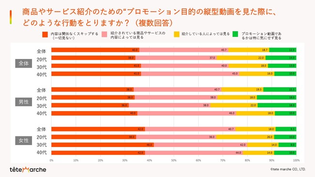 【紹介されている商品やサービスの内容によっては見る】が40.7%。次いで、【内容は関係なくスキップする(一切見ない)】が40.0%、【紹介している人によっては見る】が18.7%、【プロモーション動画であるかは特に気にせず見る】が12.3%という結果になりました。