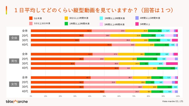 【5分未満】の回答が41.3%で1位、【5分以上30分未満】が23.0%で2位、【30分以上1時間未満】が15.3%で3位という結果になりました。また、【1時間以上】を選択した結果を合わせると20.3%で、特に20代女性と30代男性は【3時間以上】が10%となり、長時間視聴しているユーザーが多く、縦長動画が注目されている結果となりました。
