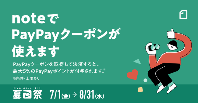 メディアプラットフォームnoteの有料コンテンツ(※1)が、2022年7月1日(金)0:00から8月31日(水)23:59まではPayPayクーポンを適用して購入できるようになります。PayPayクーポンの対象店舗がウェブサービスにも広がる第一弾ラインナップに、noteも加わります。