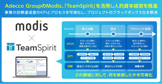 Modisは、2013年より「TeamSpirit」を導入し、Salesforceと連動して案件の受注活動から受注内容、そしてプロジェクト管理までの「ヒト」と「カネ」の一連の流れをマネジメントの現場レベルで容易に把握し、リアルタイムで分析できる仕組みを構築。数字的根拠をベースとした人的資本のマネジメントに活用されています。