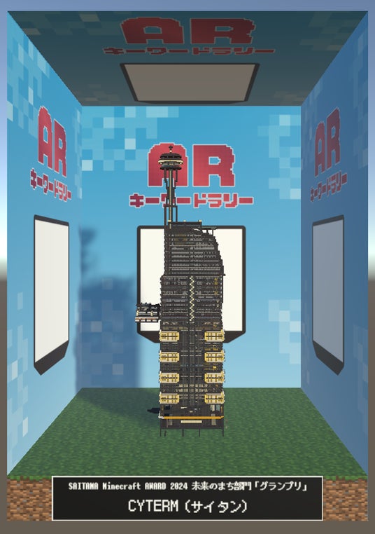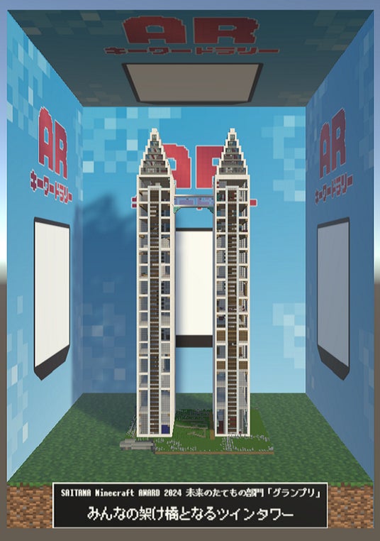 - スマートフォン等でポスターのQRコードを読み込むと、SAITAMA Minecraft AWARD 2024の「受賞作品」と「キーワード」がスマートフォン越しにARで登場します。※SAITAMA Minecraft AWARD 2024のグランプリ、市長特別賞、審査員特別賞の5作品をホロラボが提供するWeb AR技術により可視化しています。※表示される「作品」と「キーワード」は場所ごとに異なります。