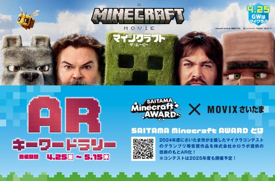 株式会社ホロラボ(本社:東京都品川区、代表取締役CEO:中村 薫、以下「ホロラボ」)は、さいたま市、株式会社松竹マルチプレックスシアターズ(MOVIXさいたま)と連携して、2025年4月25日(金曜日)か ら、マイクラの実写化映画『マインクラフト/ザ・ムービー』の公開にあわせて、MOVIXさいたま劇場内、及びコクーンシティ館内各拠点で 「ARキーワードラリー」を実施します。 「ARキーワードラリー」では、さいたま市主催「SAITAMA Minecraft AWARD」の受賞作品がARで再現されます。映画を鑑賞して、キーワードを集めた方には映画やさいたま市に関連したノベルティをプレゼントします。