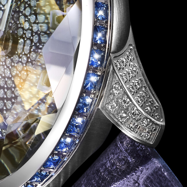 風防を中心部まで大胆にカットしたダイヤモンドカットが最大の特徴。腕時計全体がアクセサリーのように輝きます。文字盤の中央には、小粒のクリスタルガラスを敷き詰め、シルバーのインデックスと共に、ラグジュアリー感を演出。ケースの周囲にはキュービックジルコニアを、ラグにはクリスタルガラスをセット。ベルトには文字盤と同系色のカーフレザーを使用。Dバックルを採用することで片手で簡単に着脱ができ、革の痛みも軽減します。テンデンスの現行モデル中最薄のケースを採用し、ファッションに合わせ腕元をエレガントに飾ります。