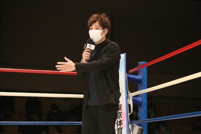 大会前のリング挨拶では「普段後楽園ホールのリングは上がることないんですけど、1度だけ上がったことがありまして、それは山崎vsモリマン対決(※ダウンタウンのガキの使いやあらへんで!の人気企画)の前説でした。それ以来でございます」とコメントし、会場からは笑いも起こりました。