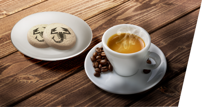 エスプレッソの聖地ナポリで“真のナポリコーヒー”と謳われるKIMBOの特製エスプレッソを、苦味と風味の豊かな“アバルトテイスト”で提供。さらに、アバルトのロゴをイメージしたオリジナルクッキーのご用意も。