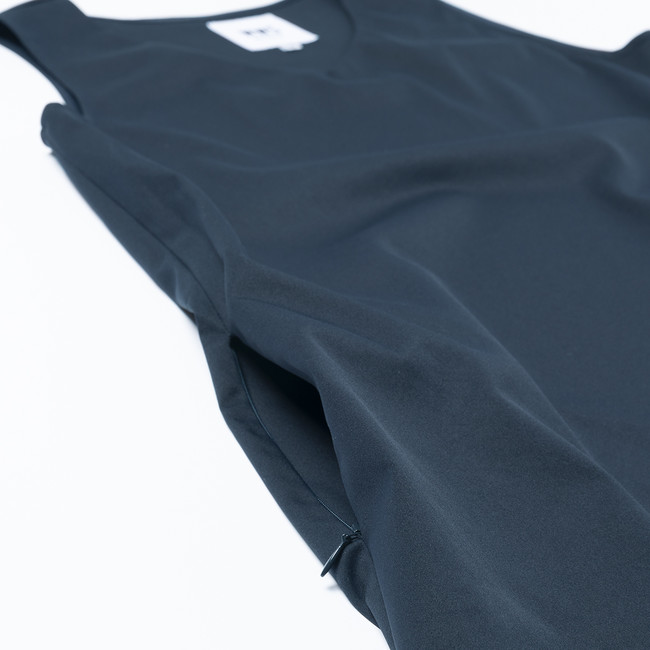 独自開発の新素材「Ultimex/アルティメックス」を使用し、365日洗濯機で丸洗いでき、しわになりにくく、3時間で乾く驚きの機能性を実現。取り外し可能なウエスト紐は付けるとキチンと見え、外すと落ち感のあるリラックスシルエットの2way仕様。裾にかけて広がっていくAラインシルエットは体のラインを拾わず、女性らしいエレガントさを演出。シャープなVネックは顔周りをすっきりとした印象に。サイドのジップポケットはスマホや三つ折り財布も収納可能。