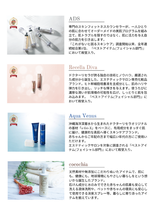 また、BEST BEAUTY ITEM フェイシャル部門では、「ADS」 「Recella Diva」 「アクアヴィーナス」が3年連続受賞で殿堂入りしました。