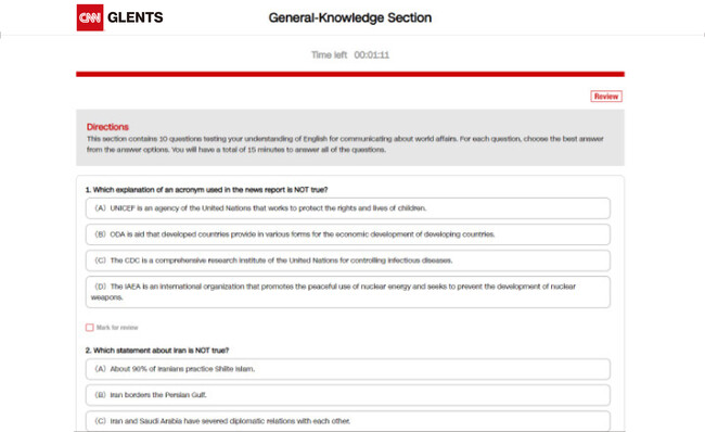 リスニング問題、リーディング問題、いずれも世界をリードするニュースメディアCNNの英語ニュースから出題。政治、経済、科学、教育、文化など幅広いジャンルから、世界の「いま」を理解するために必要な英語力を測定します。実際のニュース映像を使った「動画視聴問題」も導入しています。