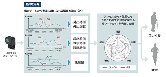 JDSCは、2020年より中部電力株式会社(本社:名古屋市、代表取締役社長 社長執行役員:林 欣吾、以下「中部電力」)、合同会社ネコリコ(本社:東京都千代田区、職務執行者:山中 泰介、以下「ネコリコ」)、三重県東員町、東京大学と連携し、「電力データ解析によるフレイル検知AI技術」(特許第6830298号)を開発しました。電気使用量から外出回数や睡眠時間、活動量などの情報をAIが分析し、健康状態と要介護状態の中間に位置するフレイル状態を検知するものです。高齢者の介護予防事業に繋げる取り組みとして、中部電力がこの技術を使い2023年4月より「eフレイルナビ」のサービス提供を全国の自治体向けに開始しています。