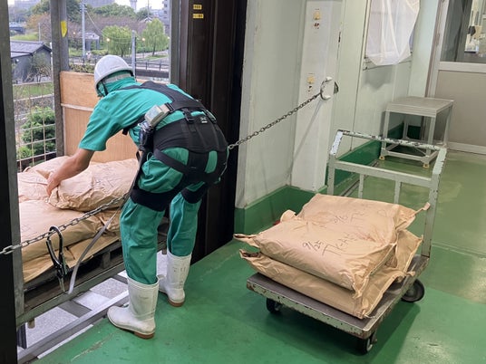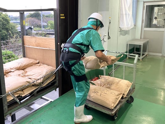 マッスルスーツSoft-Lightでの原料運搬 ※通常は作業着の中にマッスルスーツを着用しています。