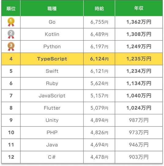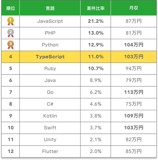 平均年収4位、案件数4位の安定感のあるTypeScriptエンジニア|フリーランス副業調査