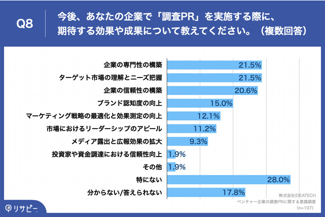 「Q8.今後、あなたの企業で「調査PR」を実施する際に、期待する効果や成果について教えてください。(複数回答)」(n=107)と質問したところ、「企業の専門性の構築」が21.5%、「ターゲット市場の理解とニーズ把握」が21.5%という回答となりました。