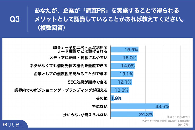 「Q3.あなたが、企業が「調査PR」を実施することで得られるメリットとして認識していることがあれば教えてください。(複数回答)」(n=107)と質問したところ、「調査データが二次・三次活用でリード獲得などに繋げられる」が15.9%、「メディアに転載・掲載されやすい」が15.0%という回答となりました。