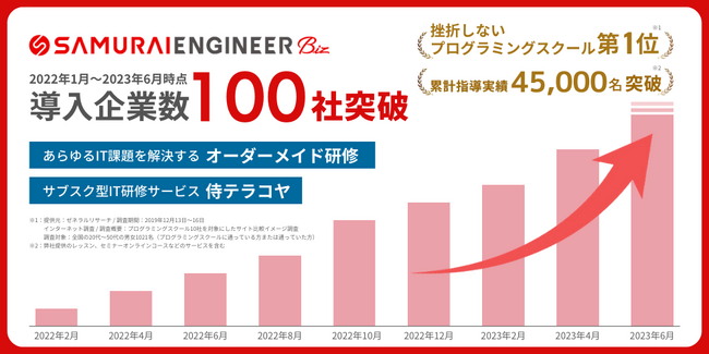 株式会社SAMURAI(本社所在地:東京都千代田区、代表取締役 :高比良 直人、以下:当社)は、法人研修サービスの導入企業数が、2023年6月時点で100社を突破しました。
