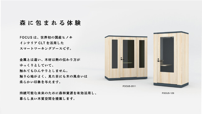 FOCUSは、国産ヒノキインテリアCLT(*)を活用したスマートワーキングブースです。