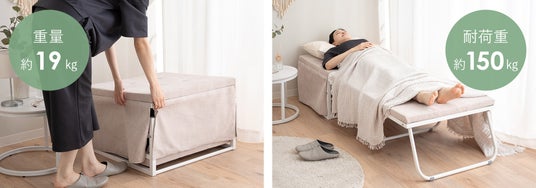 SHELTは一般的な折りたたみベッドに比べて軽量の約19kg。部屋の模様替えや移動も、1人で楽にできます。また、頑丈なフレームでしっかり支えることで耐荷重は約150kgの安心設計。安定した寝心地と座り心地を実現します。