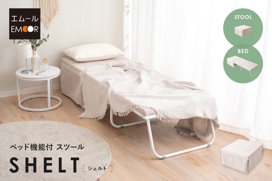「寝る・座る・たたむ」に専門性を持った健康家具ブランドEMOORを展開する株式会社エムール(東京都立川市:代表取締役 高橋 幸司)は、2025年4月1日より、ベッド機能付スツール【SHELT/シェルト】(以下SHELT)の販売を開始しました。SHELTはスツール・ベンチ・テーブル・ベッドの3WAYで使える、多機能でスペースパフォーマンス(空間効率)に優れた省スペアイテムです。