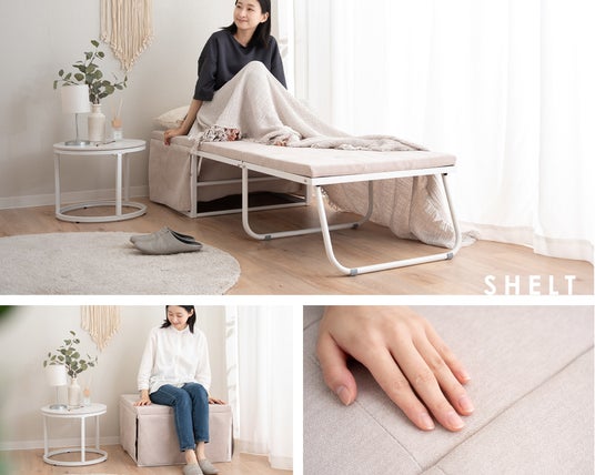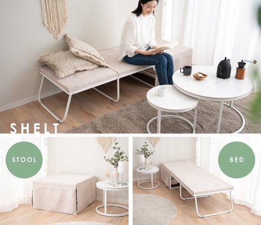 SHELTは組立不要の完成品でお届け。また、スツールの状態からカバーを取り外す必要がなく、そのままベッドに変形可能。急な来客時もすぐにベッドとして使用できる手軽さが魅力です。