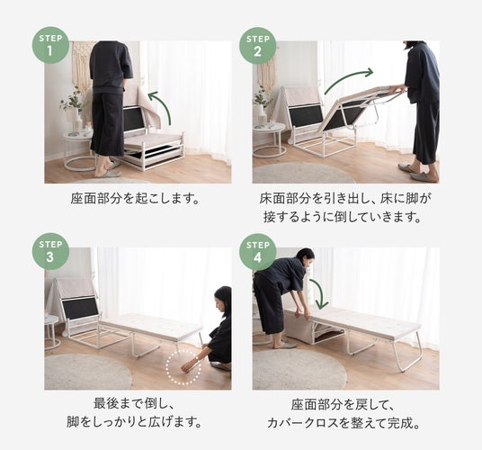 スツールからベッドへの変形は4ステップで完了。簡単に展開できるため、誰でも簡単に使えます。