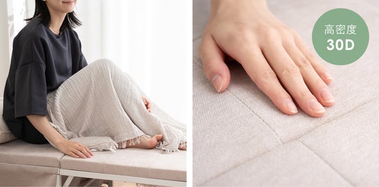 SHELTの床面は、適度な弾力とサポート力を持つウレタンフォームを採用。寝具づくりに専門性をもった健康家具ブランドEMOORならではの構造です。長時間寝ても、座っても、快適なクッション性を提供します。