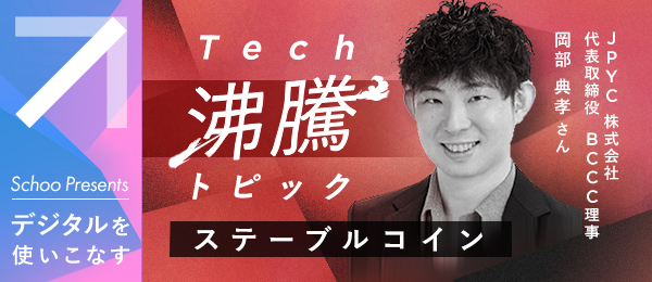 前払式支払手段扱いの日本円連動ステーブルコイン『JPYC』を取り扱うJPYC株式会社(東京都千代田区、代表取締役:岡部 典孝)は、インターネットでの学びや教育を起点とした社会変革を行う株式会社Schoo(東京都渋谷区、代表取締役社長CEO:森 健志郎)の主催するオンラインイベント「Tech沸騰トピック」に登壇し、ステーブルコインの現状と未来、新しい金融の形について講義を行います。