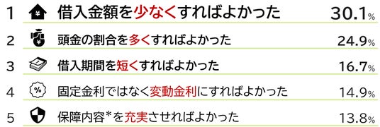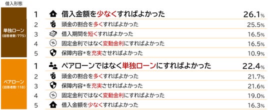 また、「保障内容を充実させればよかった」が、他のランキングに比べても上位に挙げられています。ペアローンでは借主が2人となるため、どちらかに万が一のことがあった場合のリスクも、ケースによっては大きくなります。その分、しっかりと備えておくことの重要性を、より強く感じている方が多いようです。