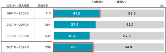 さらに後悔の有無について、住宅ローンを借り入れた時期ごとに示したのが、図表2です。最も借入時期が古い1991年~2000年に住宅ローンを借り入れ、現在も返済中の方(返済期間25年間~34年が経過している方)では、41.5%が「後悔あり」と回答しており、長期に渡る返済が、心理的・経済的な負担となっている可能性が伺えます。