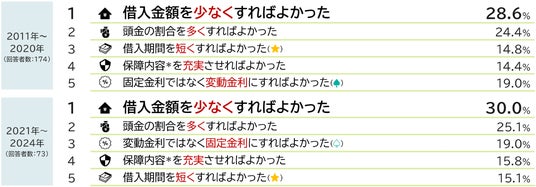 他方、「借入期間を短くすればよかった」は、借入時期が古い(=返済期間が長い)ほど上位にランクインする傾向がみられました(図表4内★)。借入期間に関する後悔は、借り入れ当初には実感しにくいものの、長年にわたる返済を経験する中で、その「道のりの長さ」に気付き、後悔する人が増えているものと思われます。また、借入金利に対する後悔も、2021年以前は「固定金利ではなく変動金利にすればよかった(図表4 内(スペード))」が挙げられていたものの、2021年以降では「変動金利ではなく固定金利にすればよかった(図表4 内♤)」に変化しており、時代ごとに多く選ばれていた金利形態の推移が伺える結果となっています。