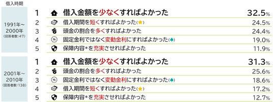 この結果についても住宅ローンを借り入れた時期ごとに確認したところ、最上位に挙がる項目は「借入金額を少なくすればよかった」「頭金の割合を多くすればよかった」が共通してみられました(図表4)。