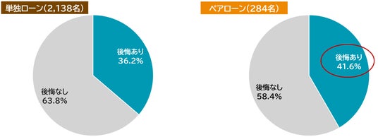 次は、住宅ローンに関する後悔を、「借入形態(単独ローンでの借入れか、ペアローンでの借入れか)」に分けて分析をしてみたところ、住宅ローンに関して「後悔あり」と回答した方の割合は、単独ローンでは36.2%だったのに対し、ペアローンでは41.6%とより高い割合になっていることがわかりました(図表5)。