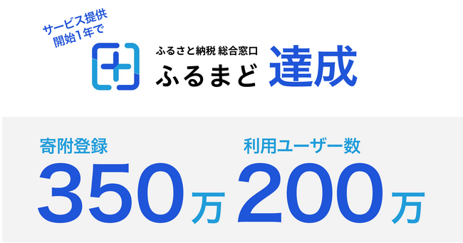 シフトプラス株式会社(代表取締役:中尾 裕也、本店:宮崎県都城市宮丸町3070番1・本社:大阪市西区江戸堀2-1-1 江戸堀センタービル 8F)は、この度新しい「ふるまど」において、サービス開始から1年で350万寄附登録、200万ユーザー登録を達成したことをご報告いたします。