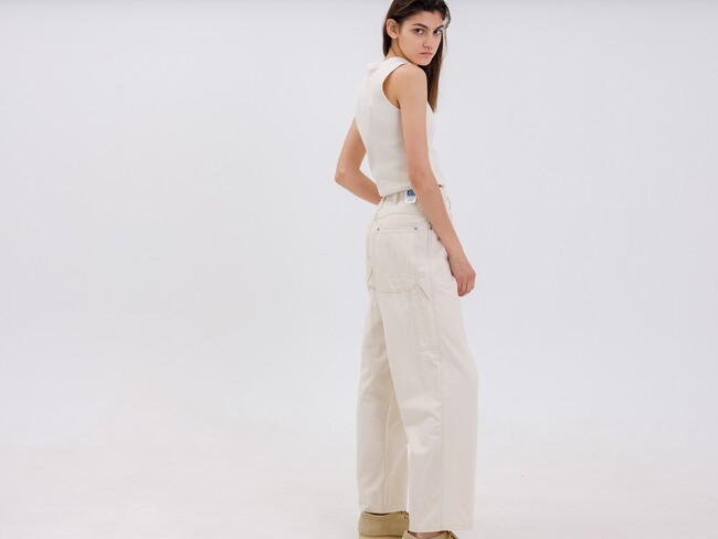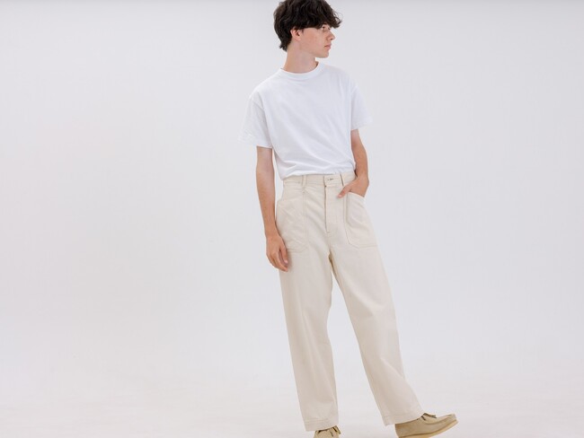春夏コーデの王道、ペインターパンツ。アメリカのヴィンテージデニムを元に作られた、ライトオンスのホワイトデニムで爽やかに仕上げながら、糸の打ち込みを限界まで強めて、ふっくらとした立体感を演出。また、1本針ミシンを2度掛けしたダブルステッチもポイント。あえてステッチワークを均一にしないことで、ワークウェアの粗っぽさを表現しています。