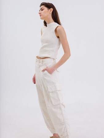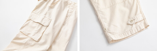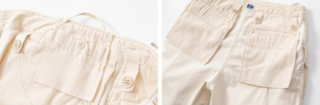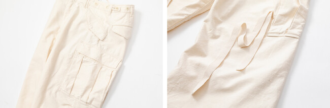 ウエスト内側にはコインポケット、カーゴポケットには止血用に備え付けられたドローコードを取り付けています。フロントファスナーには綿素材のテープを採用。本体に使用した米綿混のブレンド糸とやや太番手のムラ糸で織ったバックサテンと一緒に、自然な経年変化を楽しめます。
