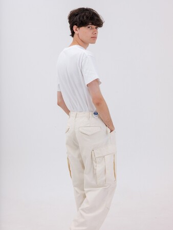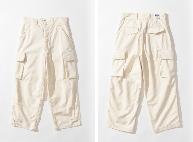 上記で紹介したモデル「SC111」と同じバックサテン生地を使用。どっしりとしたシルエットを尊重しつつ、ワタリから直線的にテーパードさせてスッキリ穿けるようにモデファイされています。その他、機能性を考慮した不揃いなベルトループや大きめのマチ付きのカーゴポケットなど、当時のディテールはそっくりそのまま。