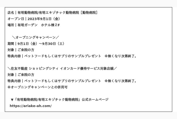 住友不動産商業マネジメント株式会社(本社:東京都新宿区 取締役社長:山本 直人)が運営する商業施設「住友不動産 ショッピングシティ 有明ガーデン」(所在:東京都江東区)の新規店舗をお知らせいたします。