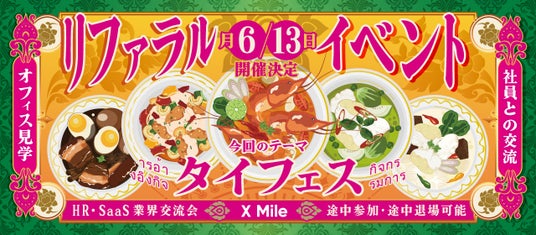 梅雨入りで蒸し暑くなるこの時期に、タイ料理を食べながらざっくばらんにHR・SaaS業界に携わる方々と交流できる点が特徴で、X Mileに関心がある方や、HR・SaaS業界の方と交流して横のつながりをつくりたい方など、どなたでも気軽に参加できるイベントとなっています。