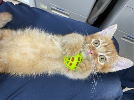 入院当初は元気のない状態が続いていましたが、回復に伴い、子猫らしく遊ぶ姿も見られるようになり、安心したことを覚えています。