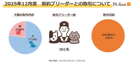 P’s-first直営店では、オークションなどの第三者を経由せず、全国の信頼できる契約ブリーダーからペットを直接取引しています。2025年12月1日から12月31日までにペッツファーストグループが取り扱ったペット、すなわち契約ブリーダーから引き受けたペットの頭数が1,699頭、そのうち犬が77.6%、猫が22.4%です。なお、12月度に引き受けたペットたちは301名の契約ブリーダーと取引いたしました。