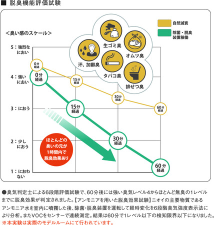室内にアンモニアを噴霧し、空気清浄装置を起動し、数十分間隔で内部空気をサンプリングした結果、装置起動後60分でにおわないレベルまで臭気が減衰していることから、脱臭効果があることが実証されました。