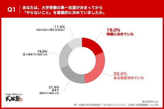 「Q1. あなたは、大学受験の第一志望が決まってから「やらないこと」を意識的に決めていましたか。」(n=105)と質問したところ、「明確に決めていた」が19.0%、「ある程度決めていた」が28.6%という回答となりました。