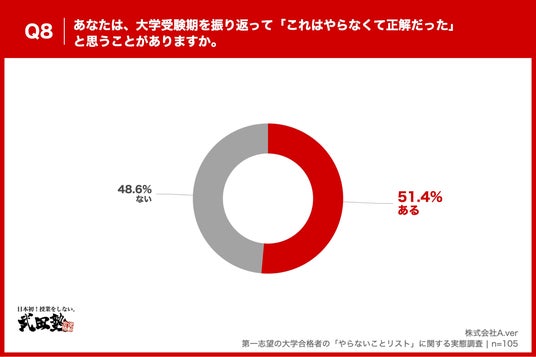 「Q8. あなたは、大学受験期を振り返って「これはやらなくて正解だった」と思うことがありますか。」(n=105)と質問したところ、「ある」が51.4%、「ない」が48.6%という回答となりました。