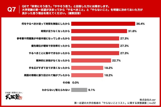 「Q7. Q6で「非常にそう思う」「ややそう思う」と回答した方にお聞きします。大学受験の第一志望が決まってから「やるべきこと」と「やらないこと」を明確に決めておいた方が良かった思う理由を教えてください。(複数回答)」(n=22)と質問したところ、「何をやるべきか迷って時間を無駄にしたから」が36.4%、「時間が足りなくなったから」が31.8%、「参考書や問題集が中途半端になってしまったから」が27.3%という回答となりました。
